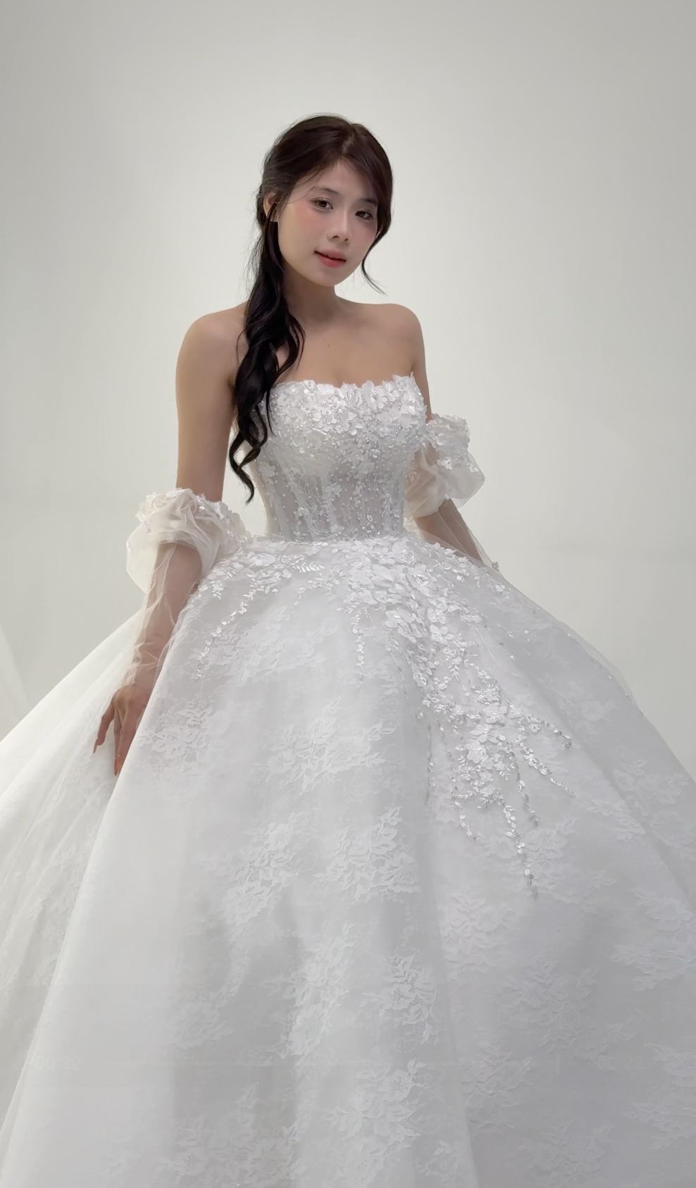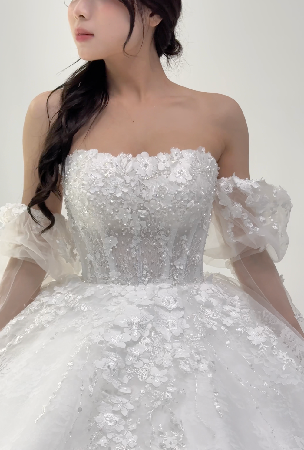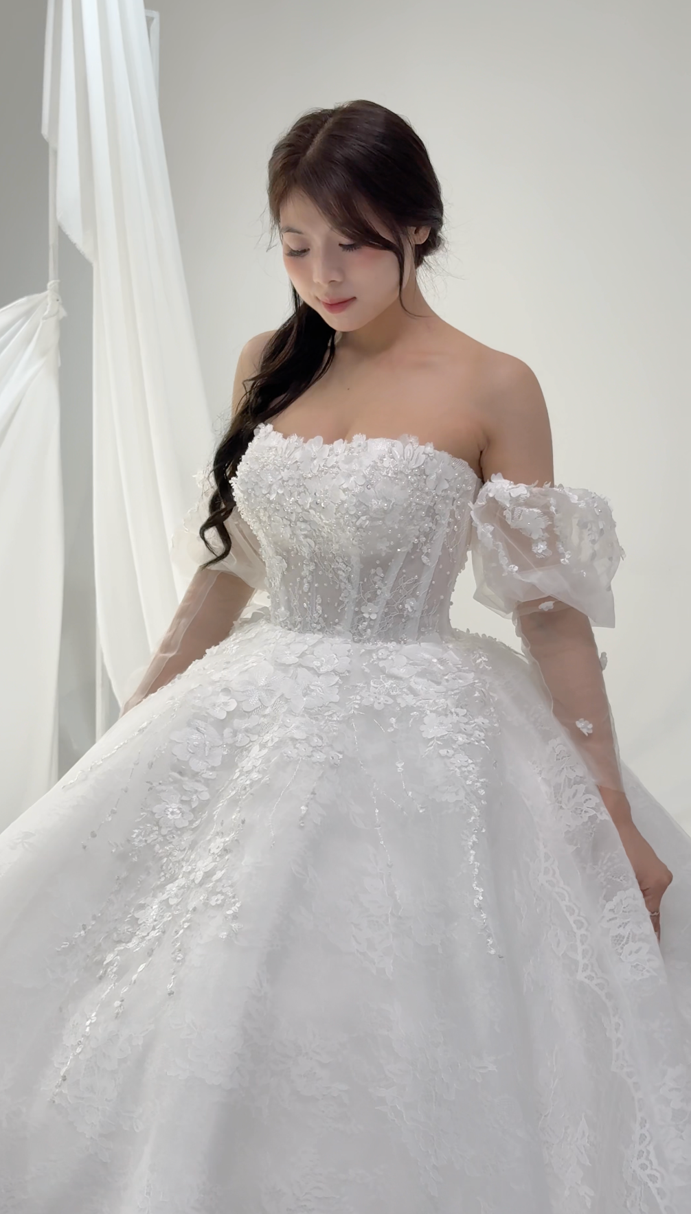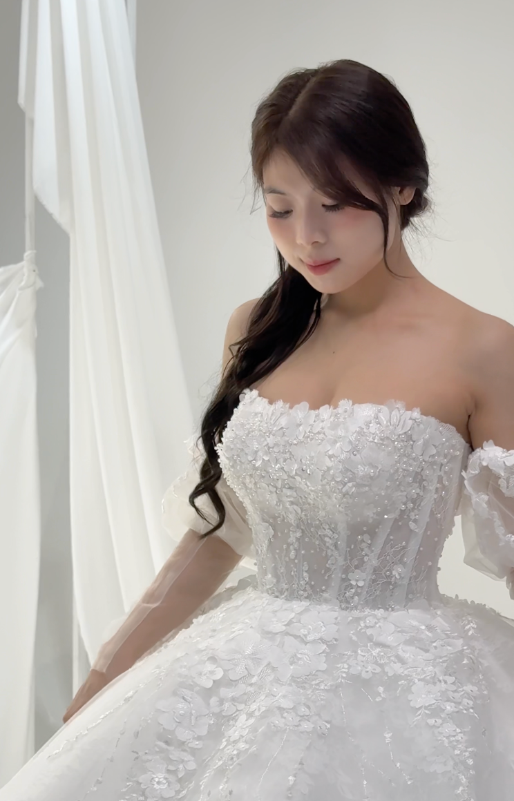 π Layered Organza Skirt: Cascades into a voluminous, flowing gown, creating a dreamy, fairytale look