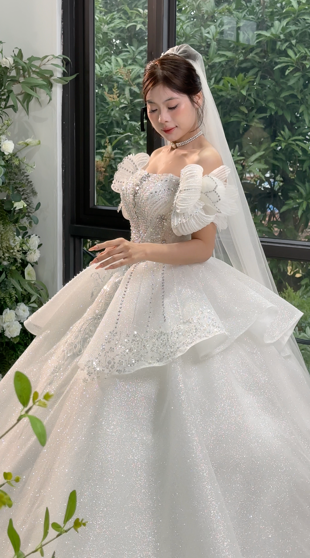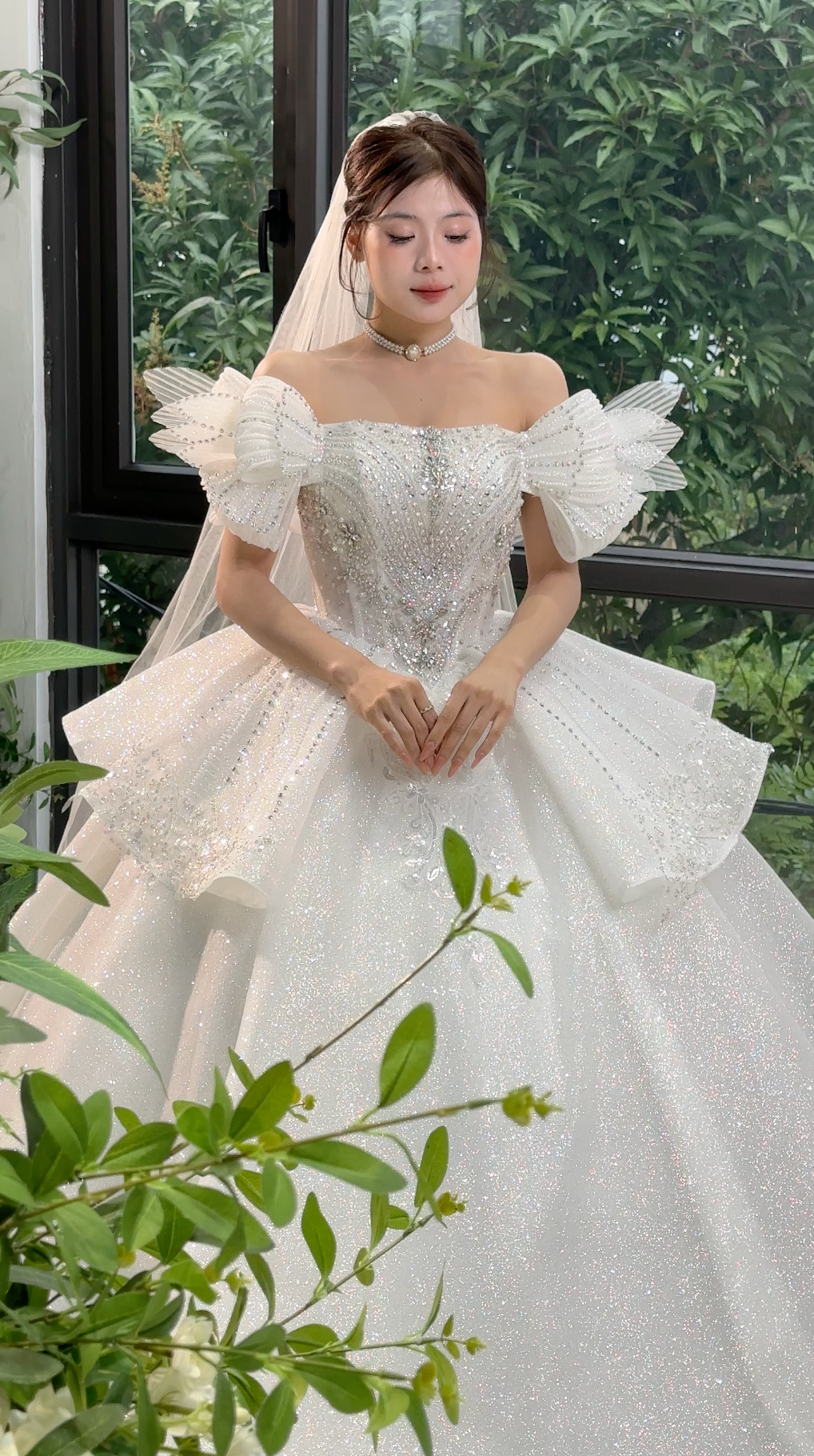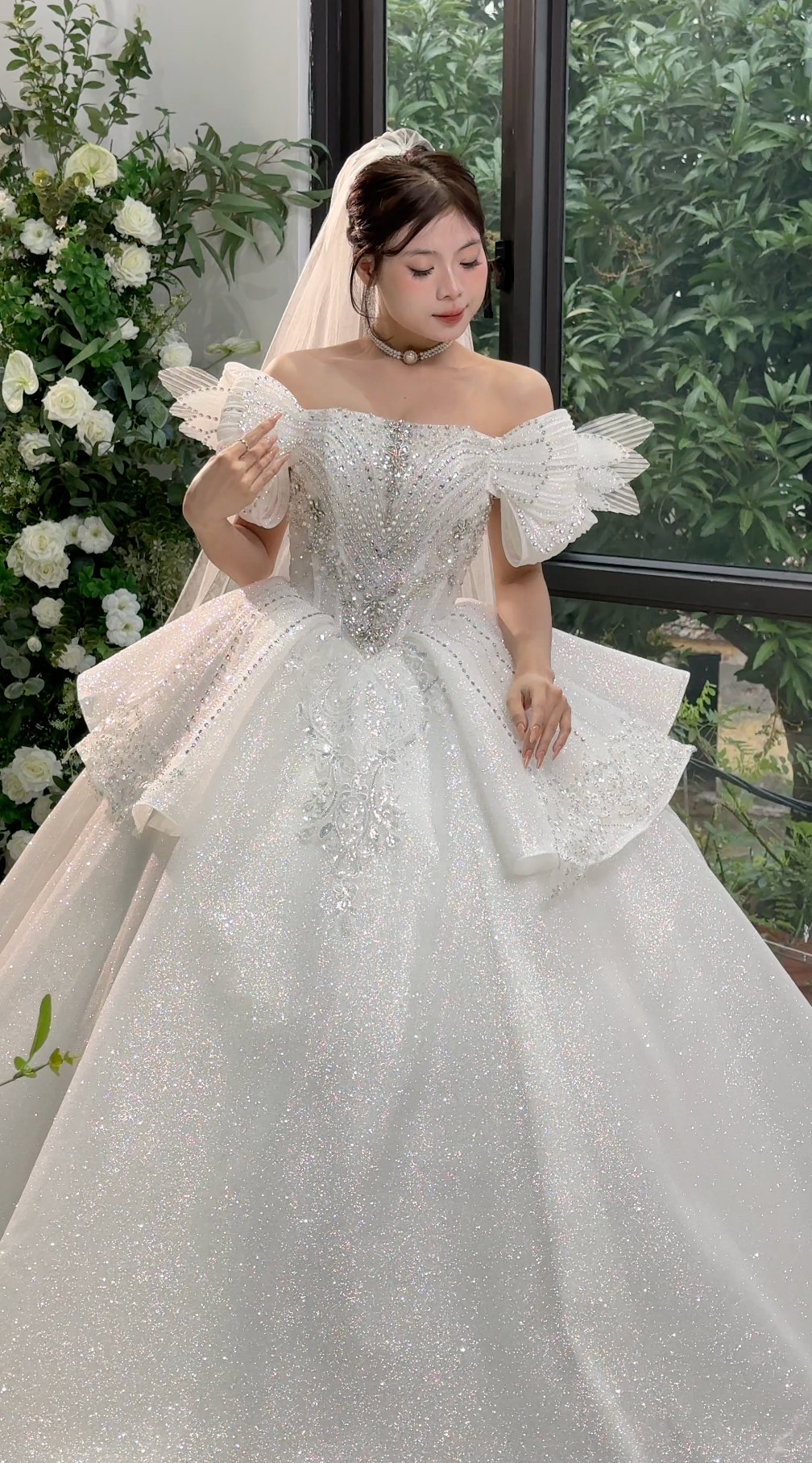 πͺ½ Off-the-shoulder design with soft tulle draped around the arms, creating a delicate, butterfly-like effect
