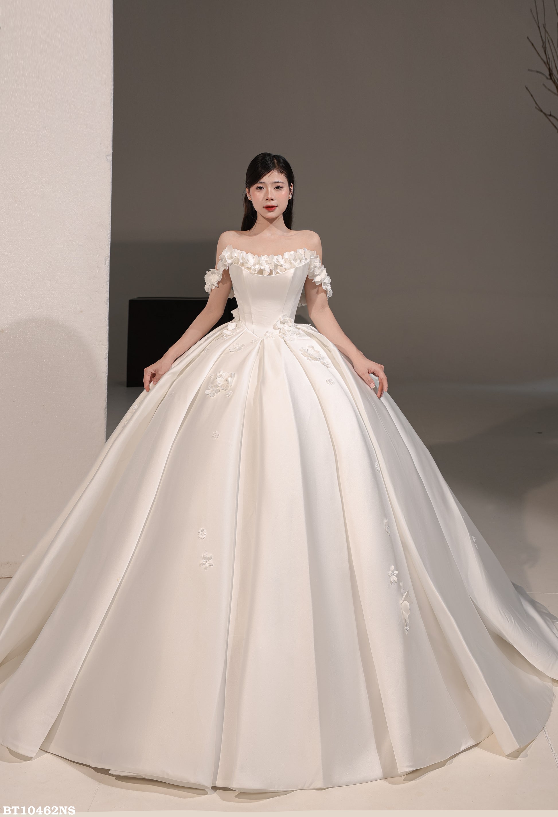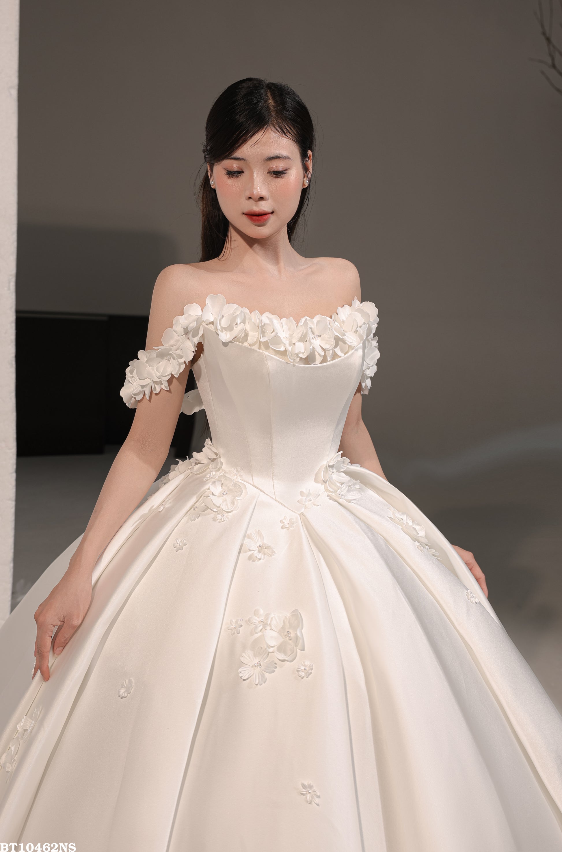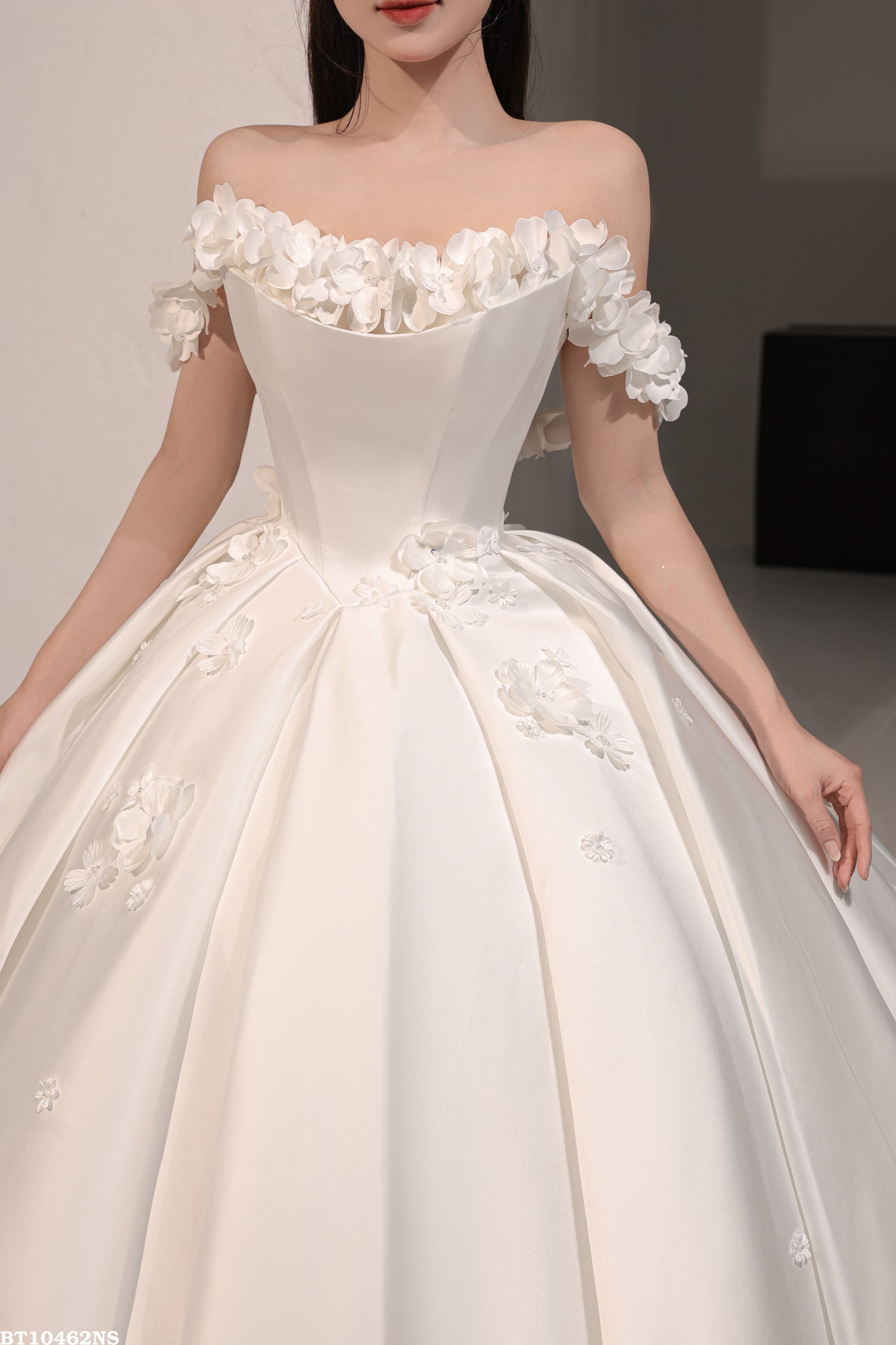 π Scattered Floral Details: Subtle flower embellishments are artfully placed along the bottom of the dress for added charm