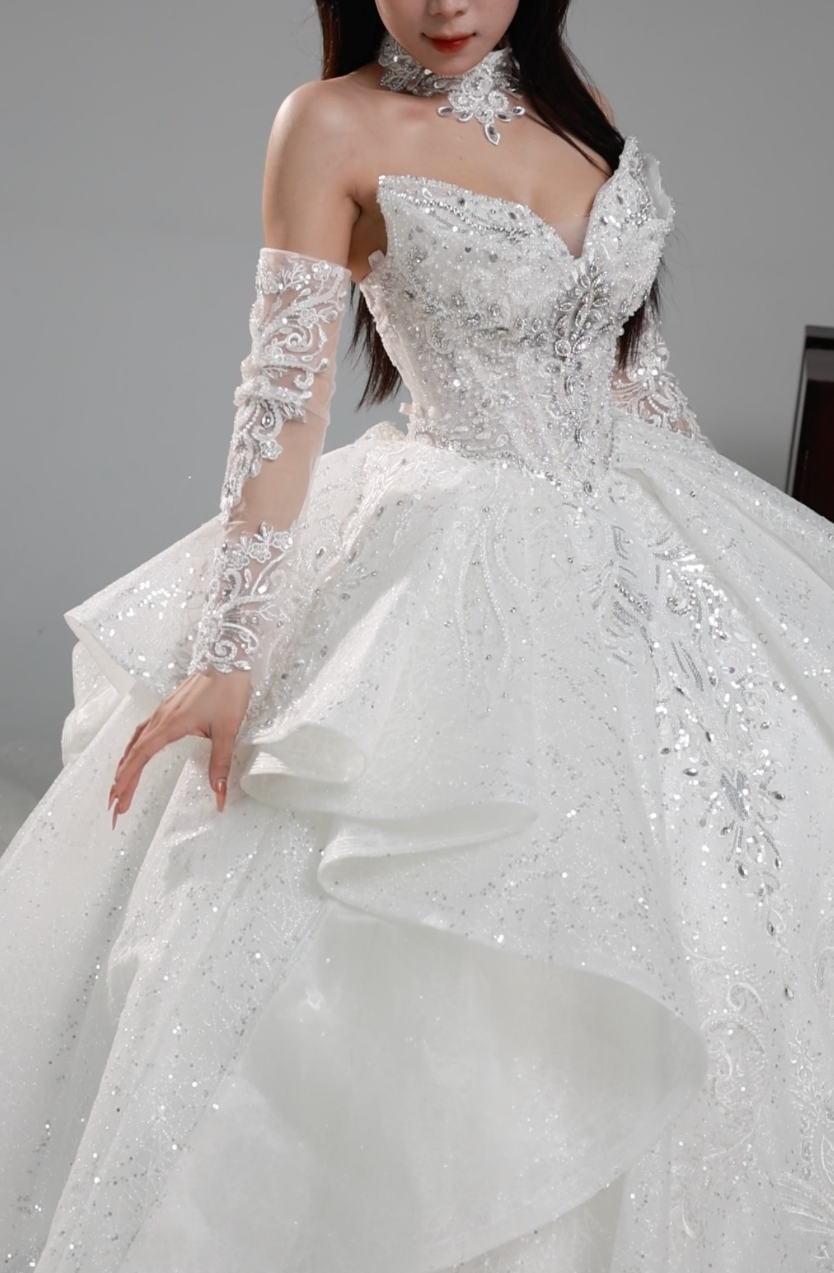 π Fitted bodice adorned with intricate embellishments, reminiscent of starlit skies
