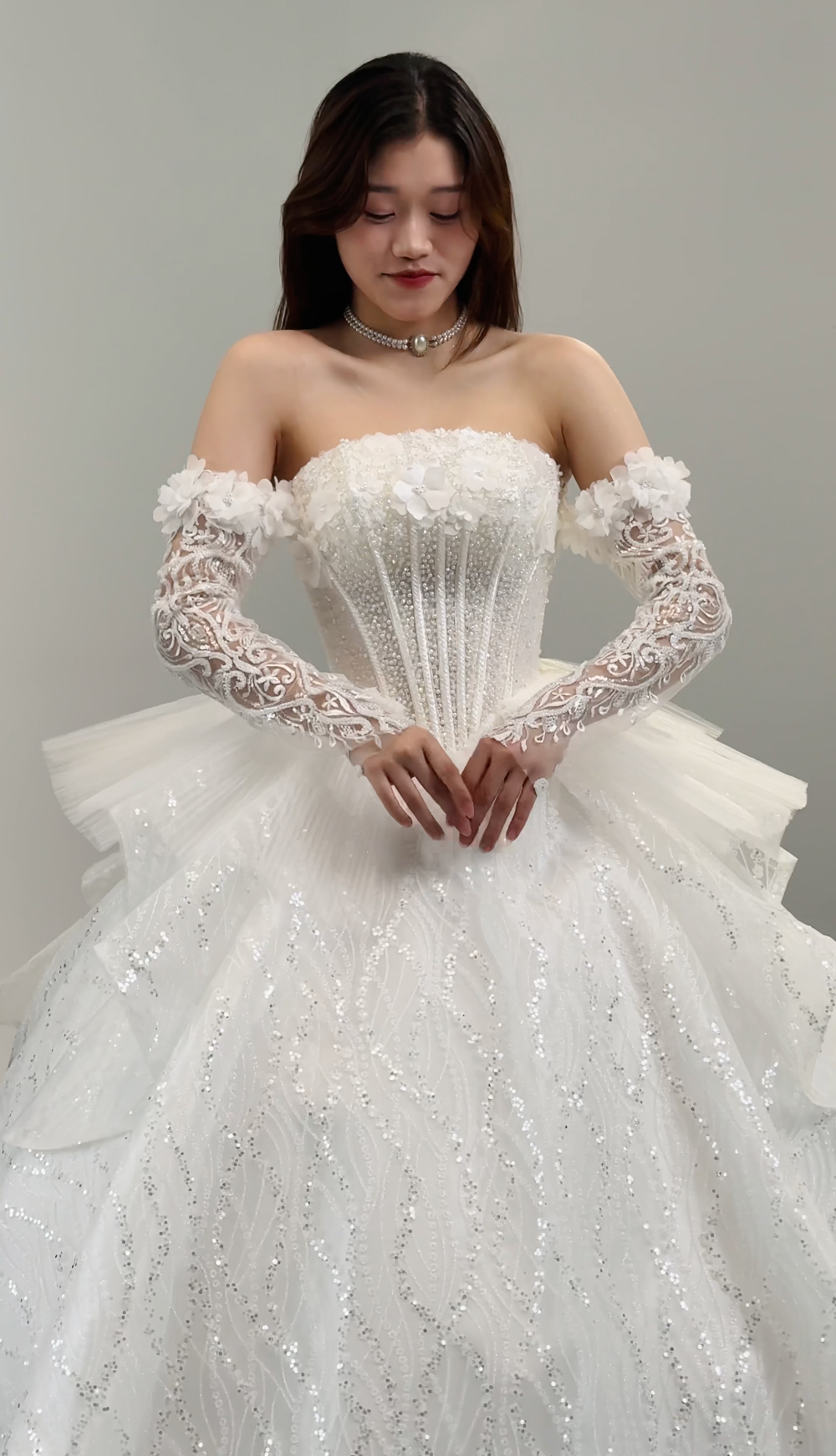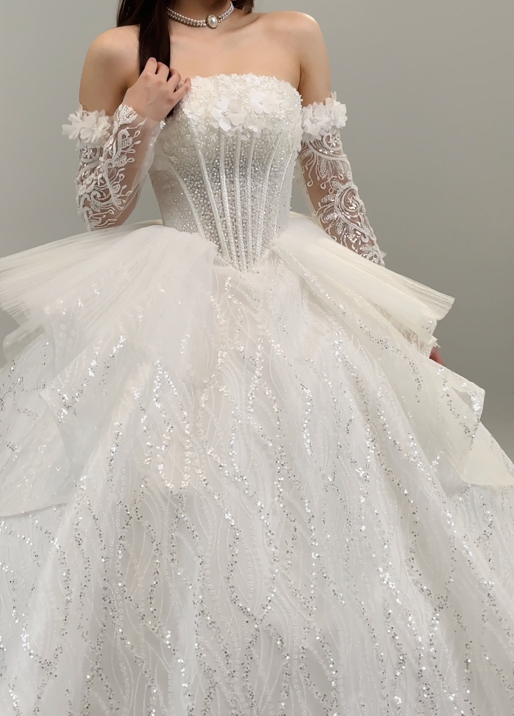 πͺ½ Detachable off-shoulder sleeves with feathered texture + beaded accents