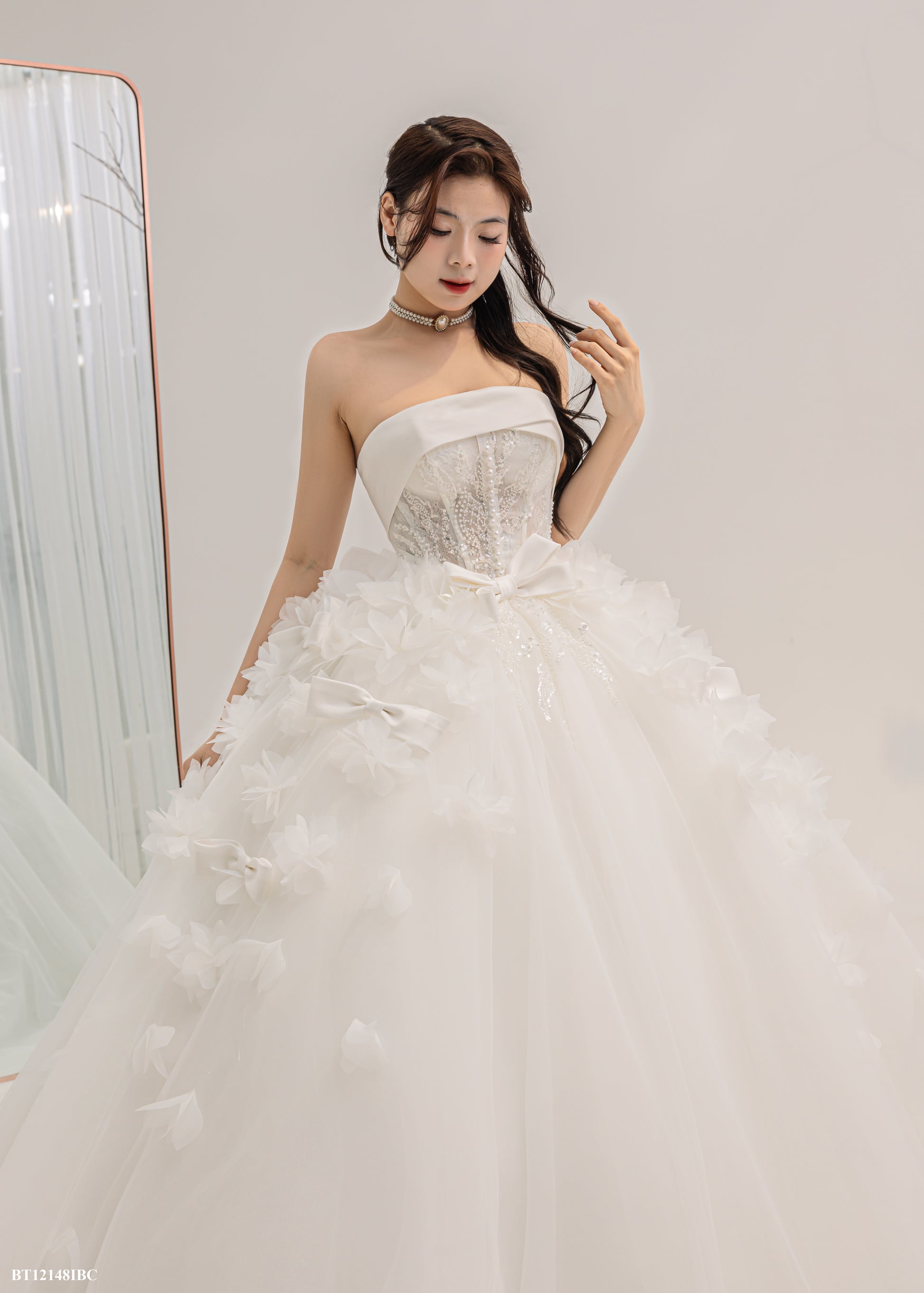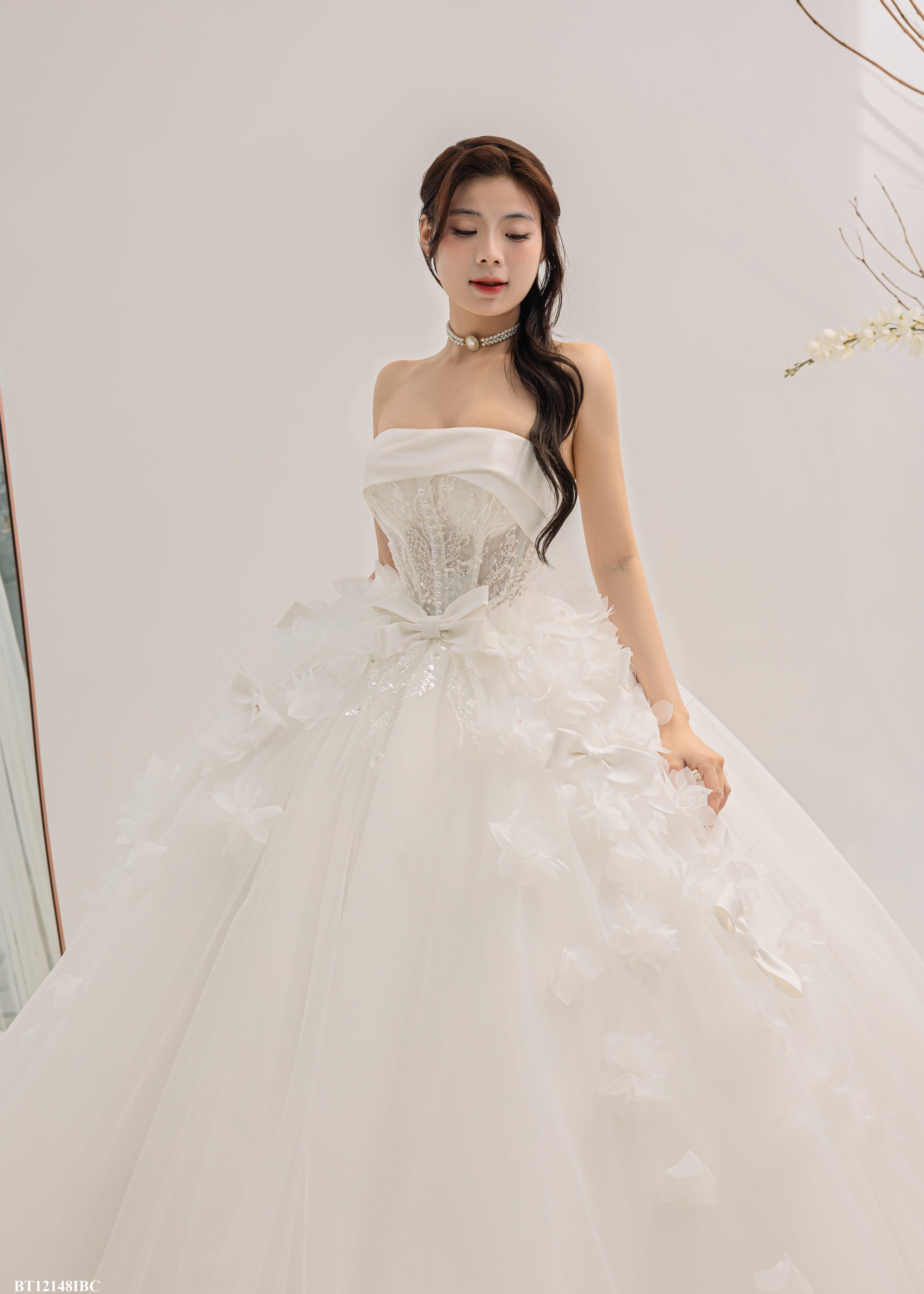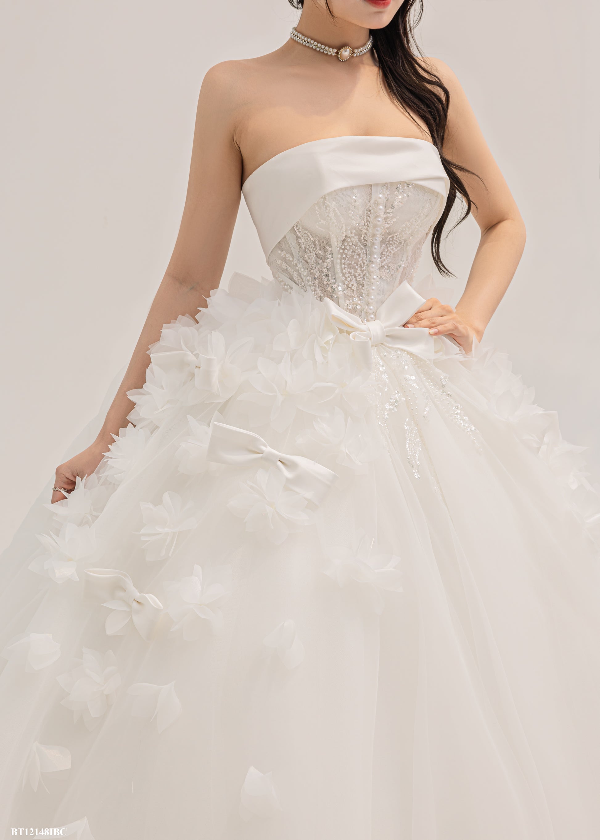 π Cascading Bow Details: Adorable satin bows cascade gracefully from the waist down to the skirt, adding playful charm