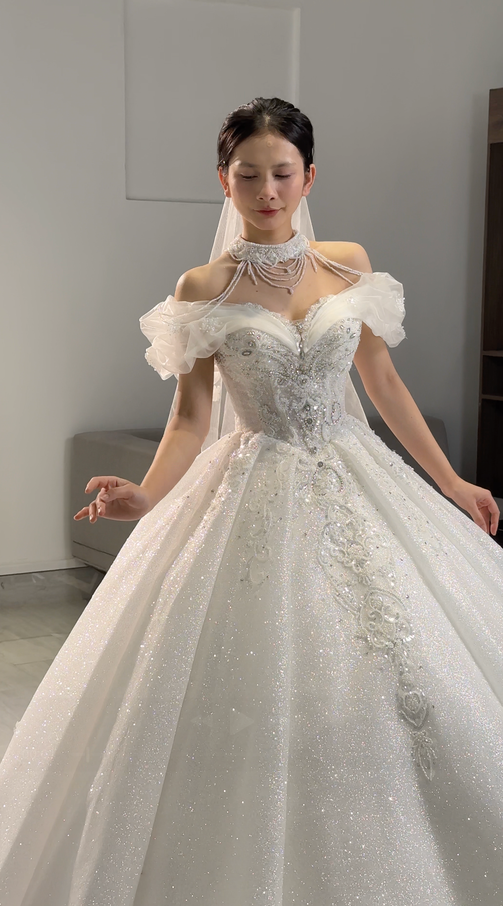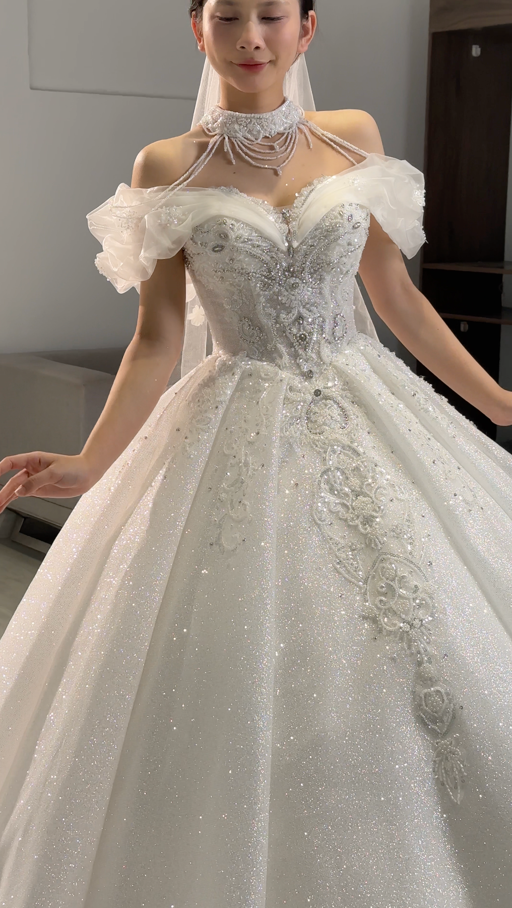 π Hand-beaded embellishments densely cover the entire bodice, adding luxurious sparkle and texture