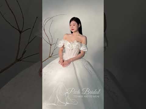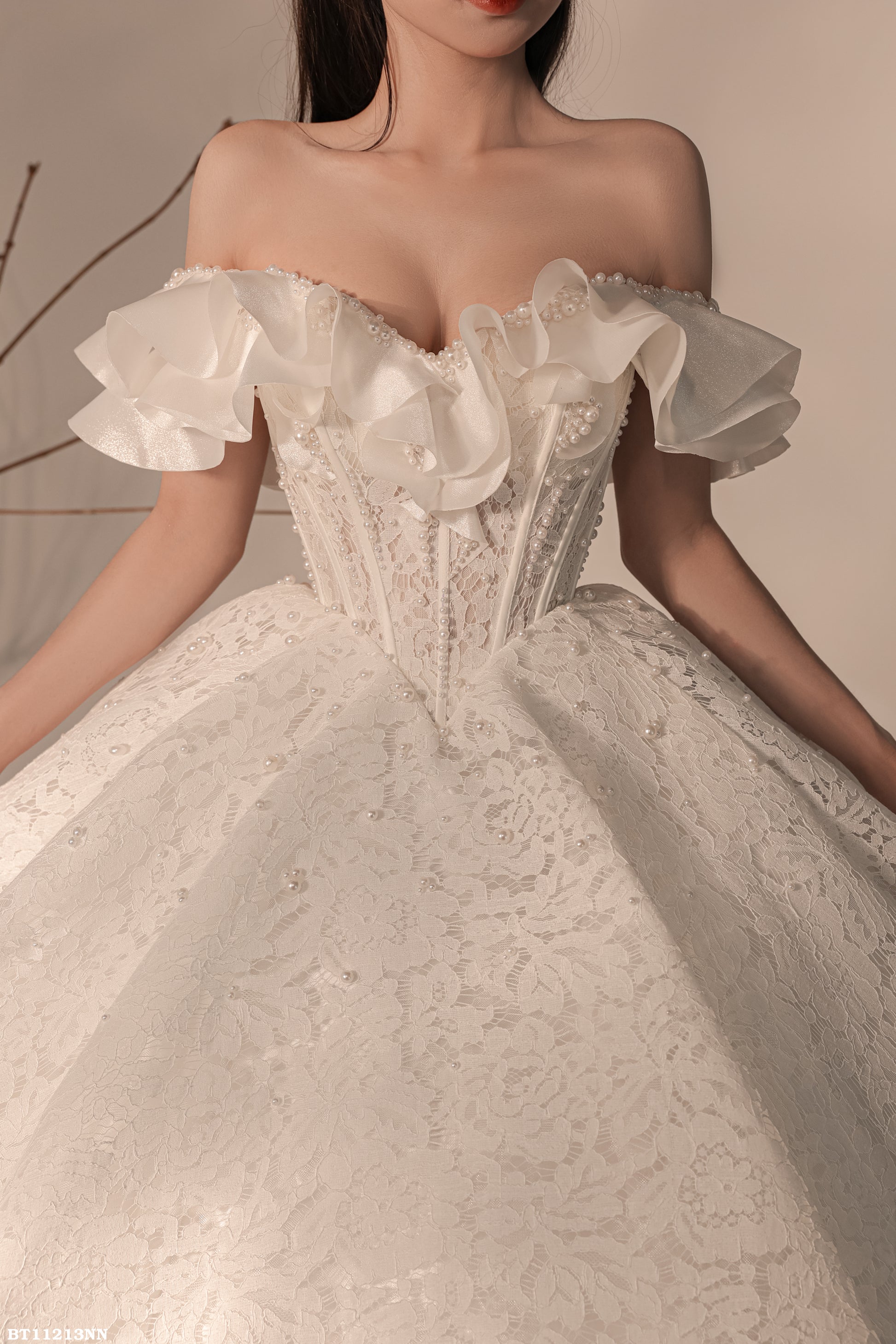 โจ Glitter Tulle Off Shoulder Design: A sparkling tulle material frames the top beautifully, enhancing the bride's natural beauty with an enchanting touch