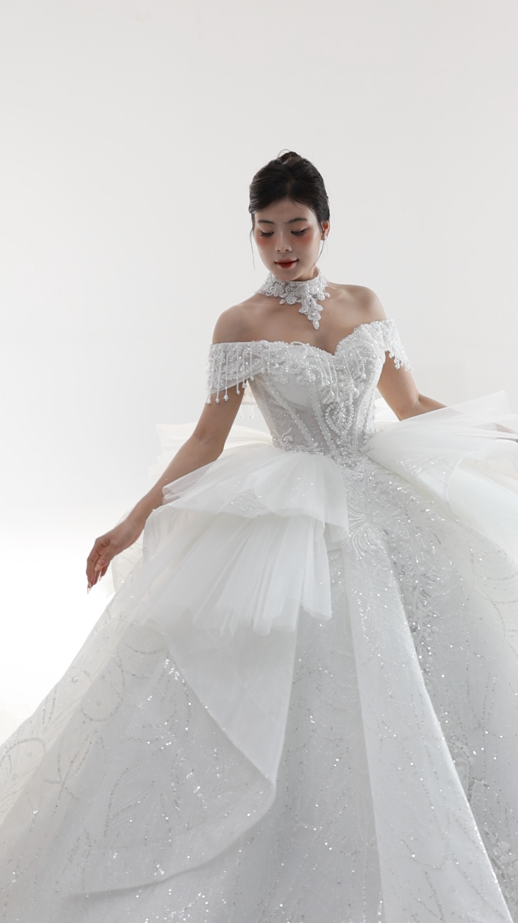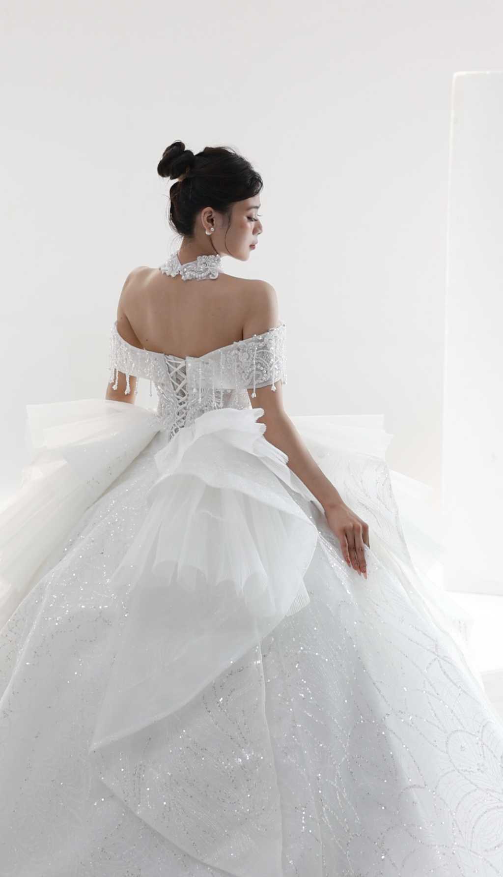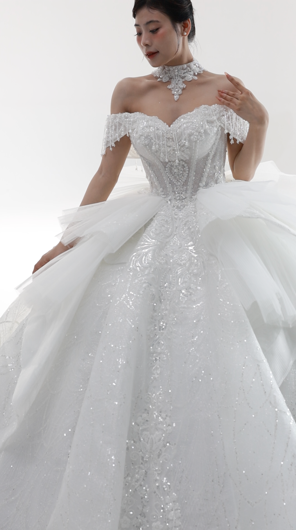 β¨ Off the shoulder neckline adorned with intricate beading, adding elegance and shimmer