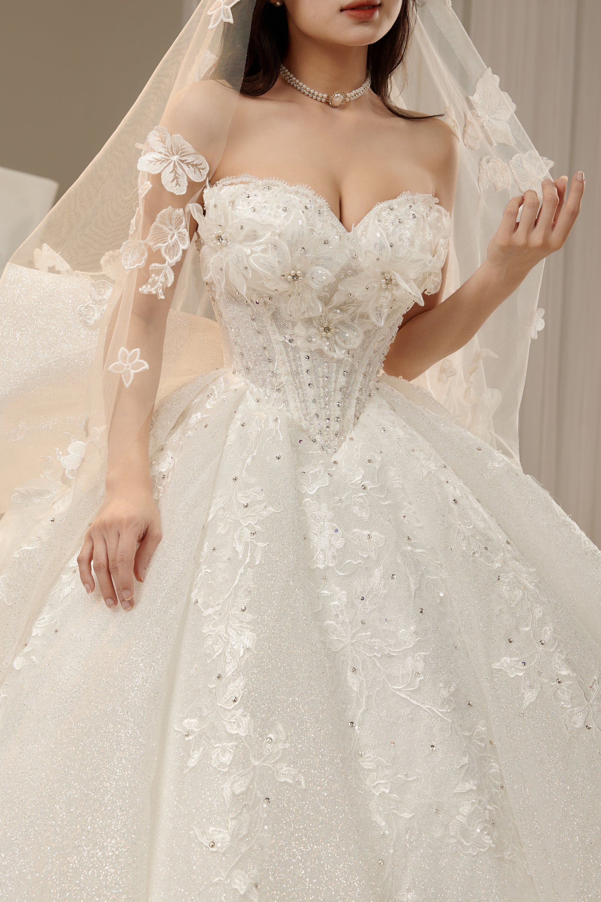 ๐ธ Floral Accents: Beautiful flower details adorn the bodice around the bust, enhancing the gownโs romantic allure
