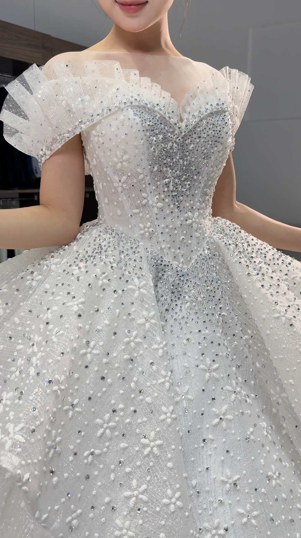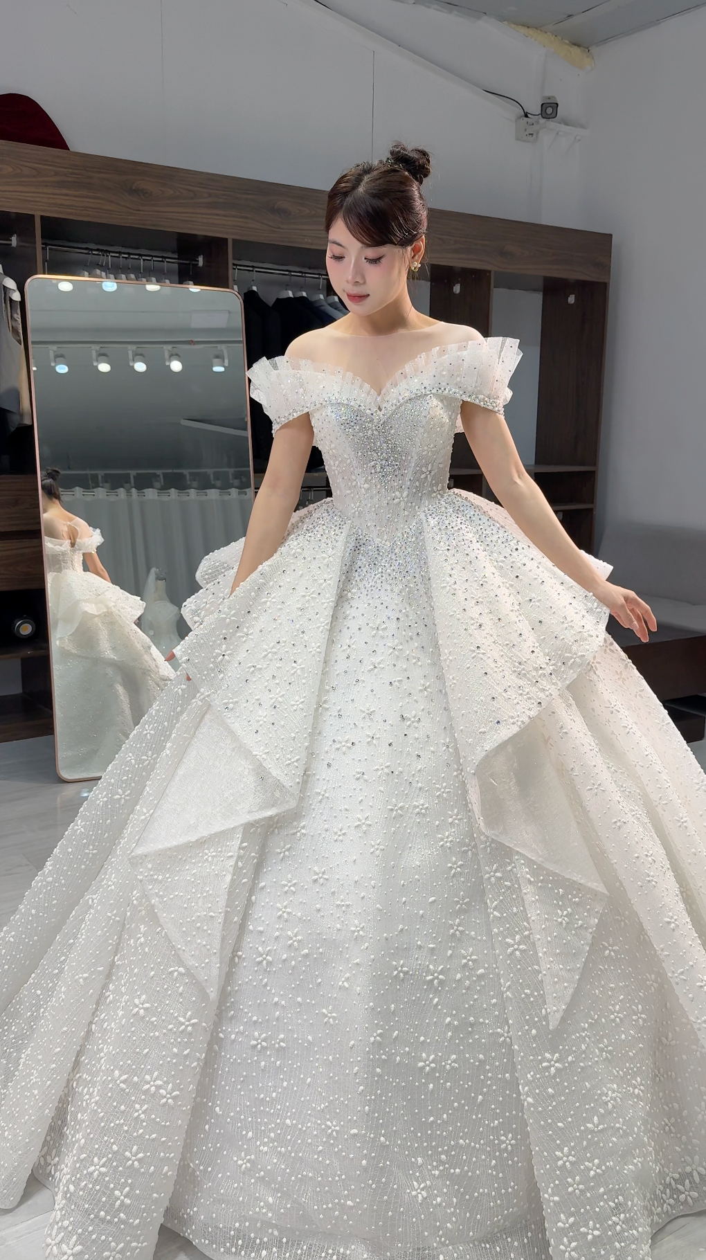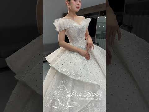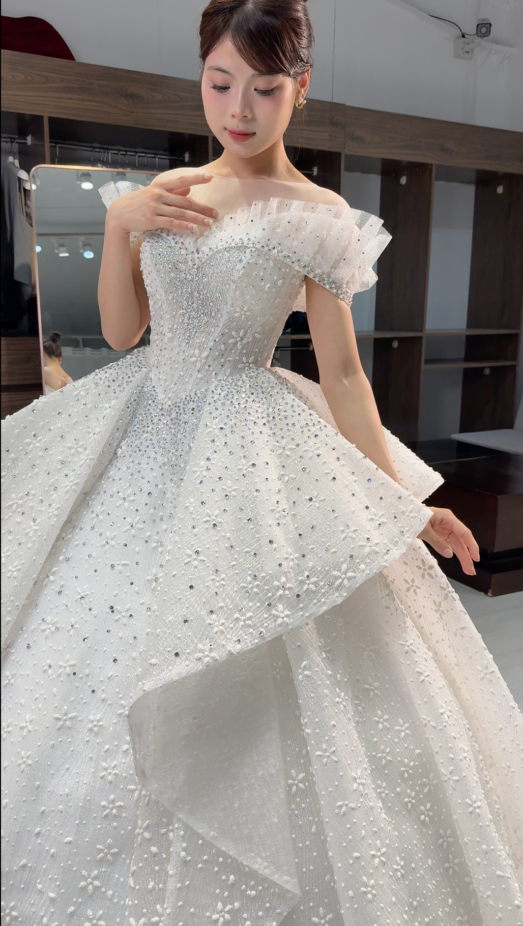 ✨ Off the shoulder neckline with soft layers of tulle that gently open up like petals
