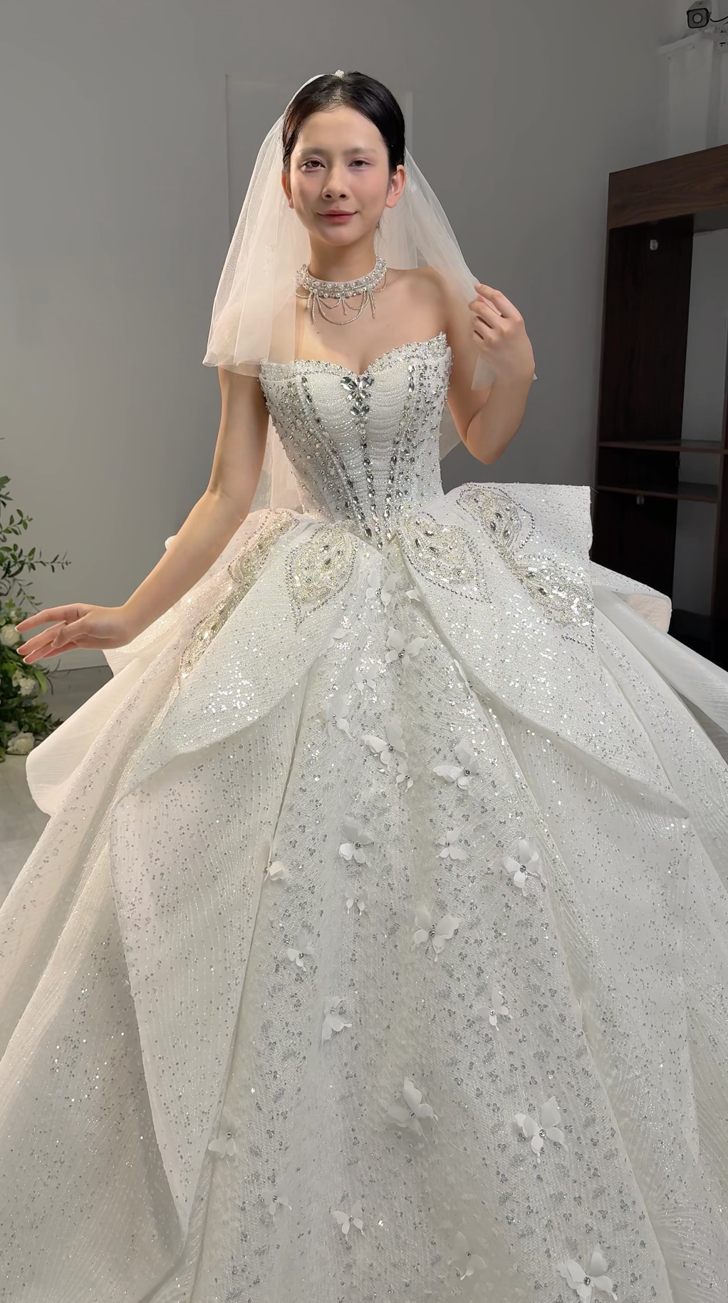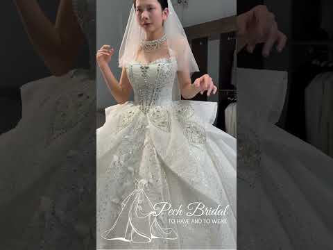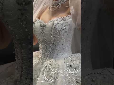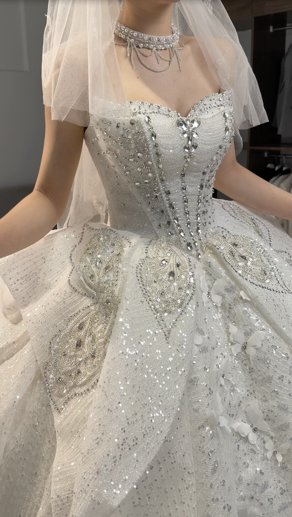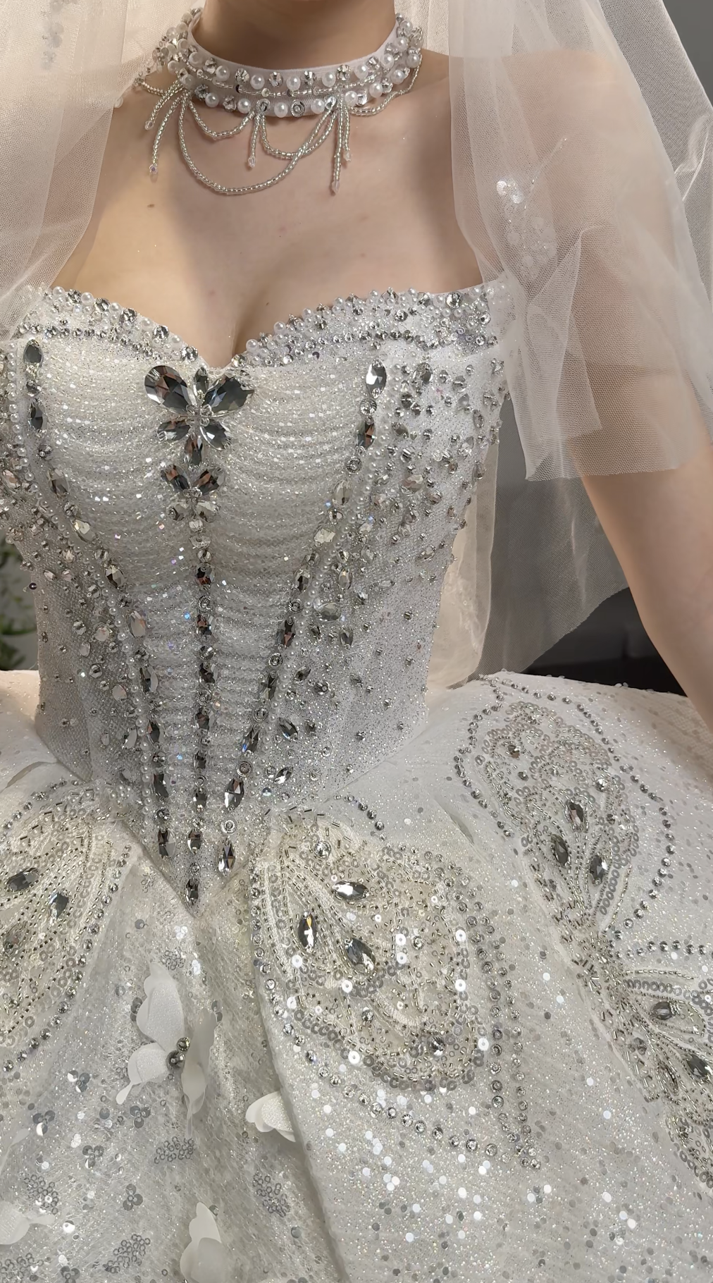 💎 Vertical lines of embellishment running down the bodice, creating a lengthening and slimming effect