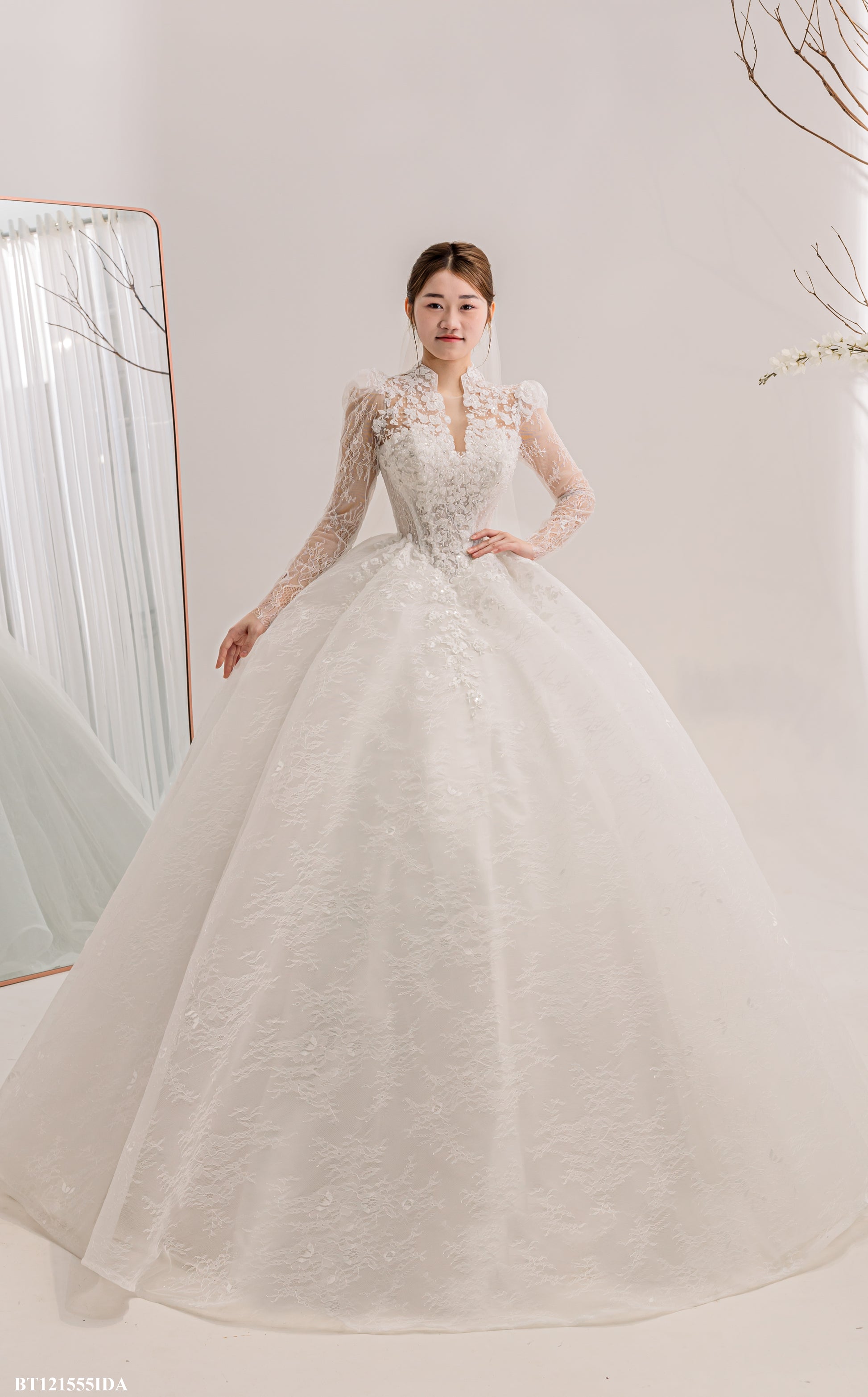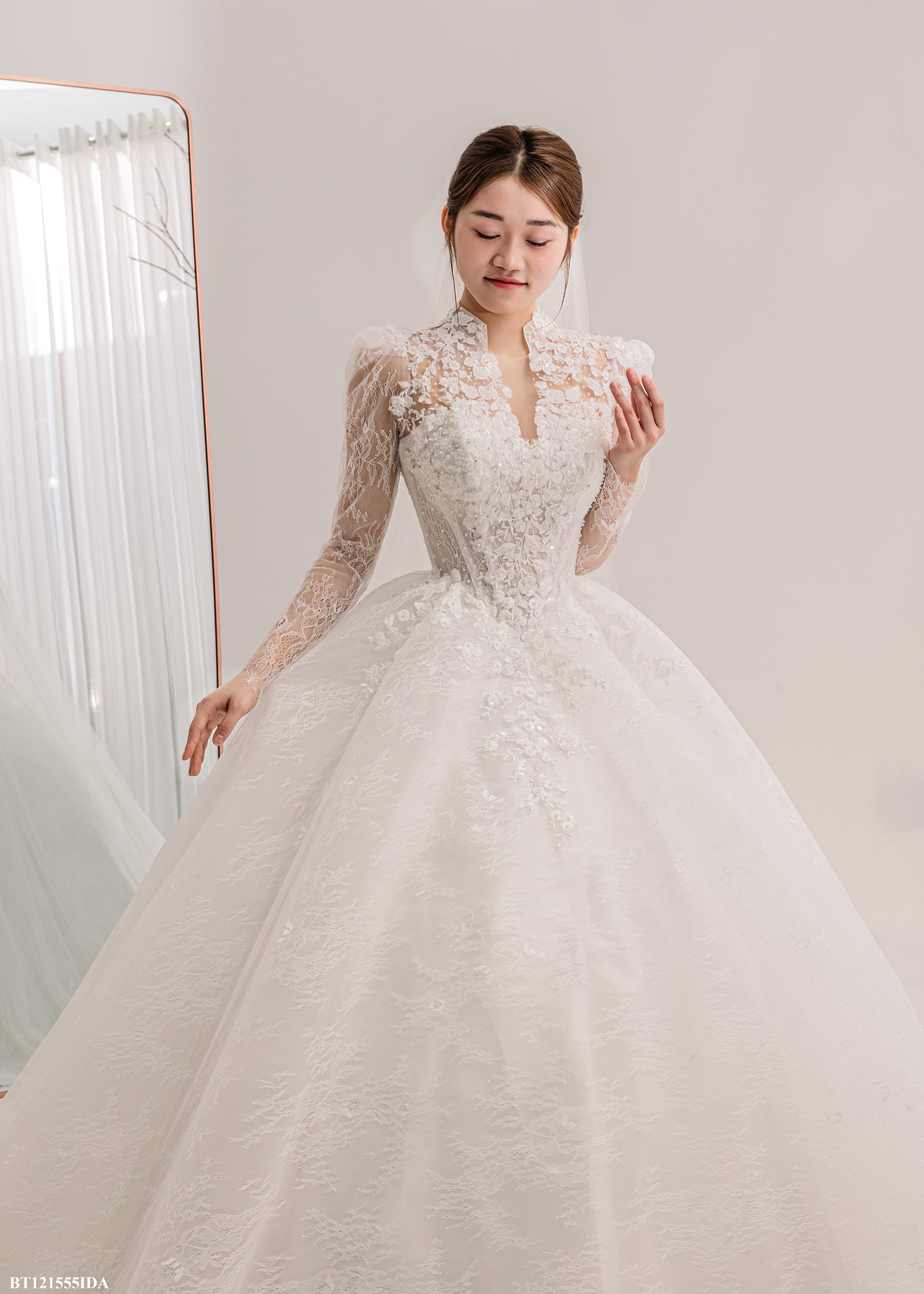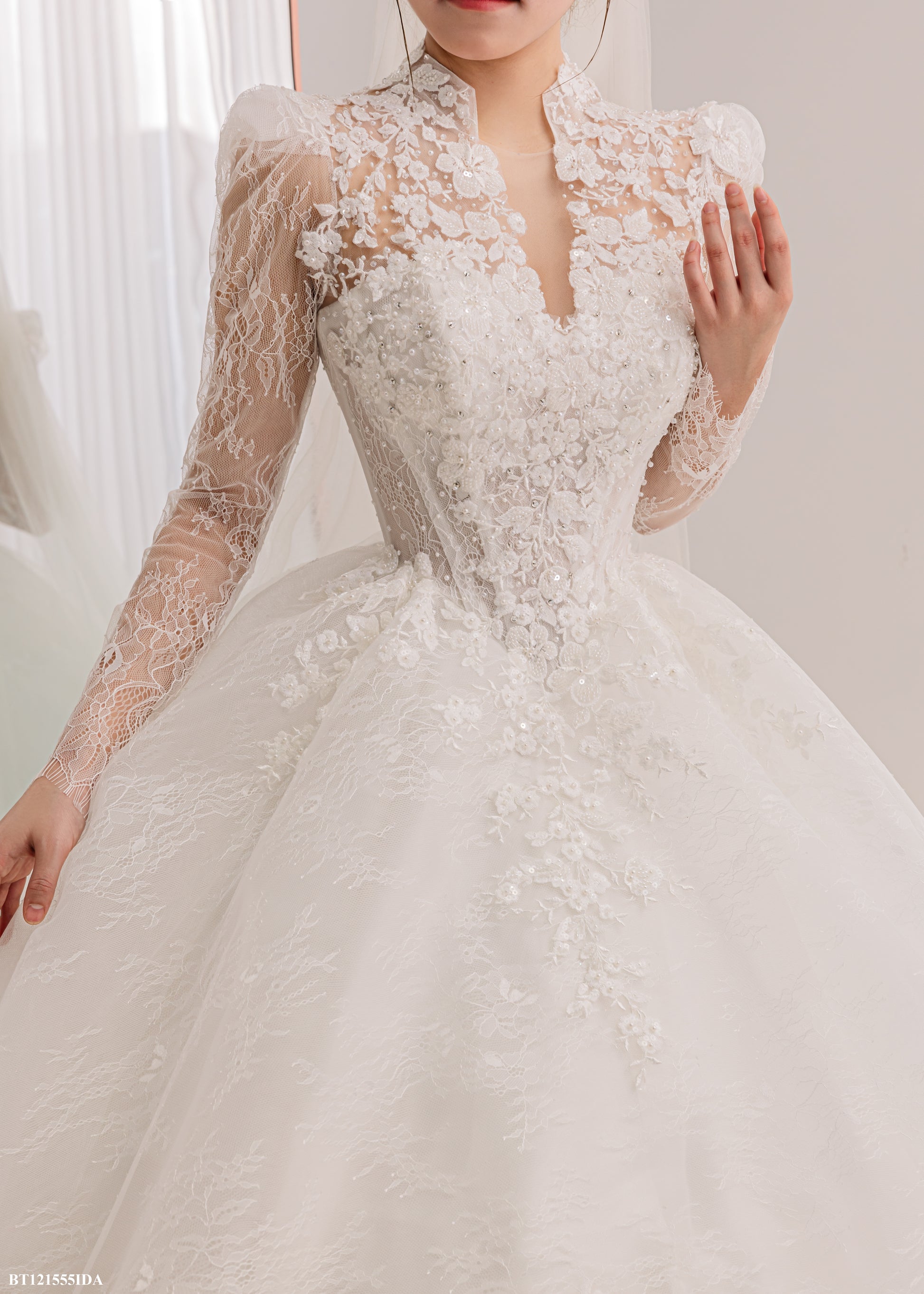 πΈ Features intricate lace detailing that adorns the fitted bodice and long sheer sleeves.